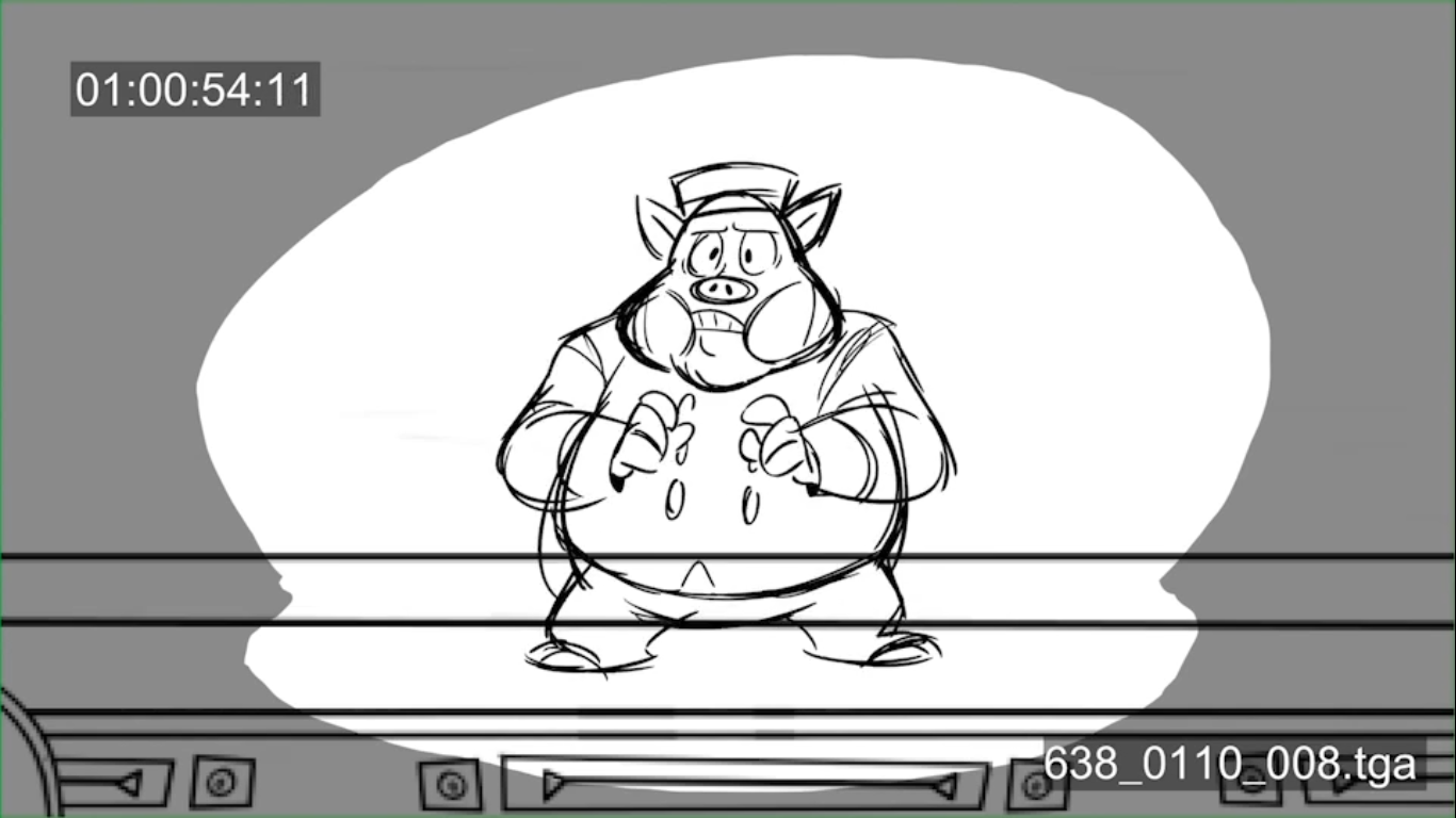 Sean's new drawings for this section. Porky does a head scratching action as he explains that he's lost his thought, with a confused look as to who exactly yelled. Sean did a new transition pose of Porky, with him trying to brush off the interruption that he might not even think was an actual interruption yet.
